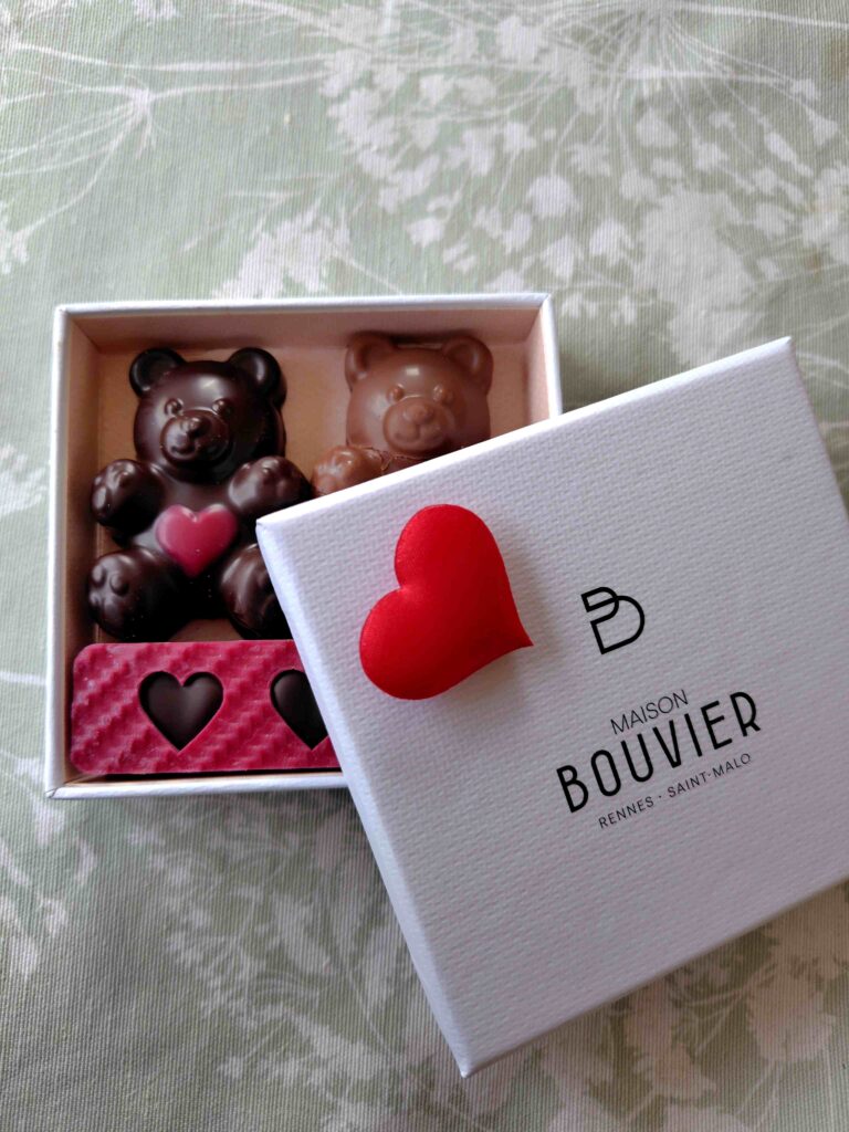 私は、日本の慣習に従って(というか、相方がチョコ好きなので)先日レンヌの街にあるおいしいお菓子屋さんBouvierで買ったくまさんチョコをあげました。このくまさんは、多くのフランス人の大好物である駄菓子のようなものを高級に作ったもの。中にギモーブというマシュマロのようなものが入っています。