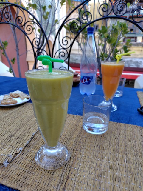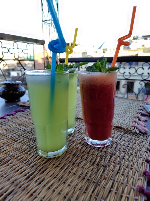 飲み物はミントティをたくさん飲みましたが、フルーツジュースもおいしかったです。スークの外国人用カフェだと、上の方のテラスで飲み物をいただけるので、ラマダンで我慢している人達の目の前で飲食したりしないで済んで、よかったです。