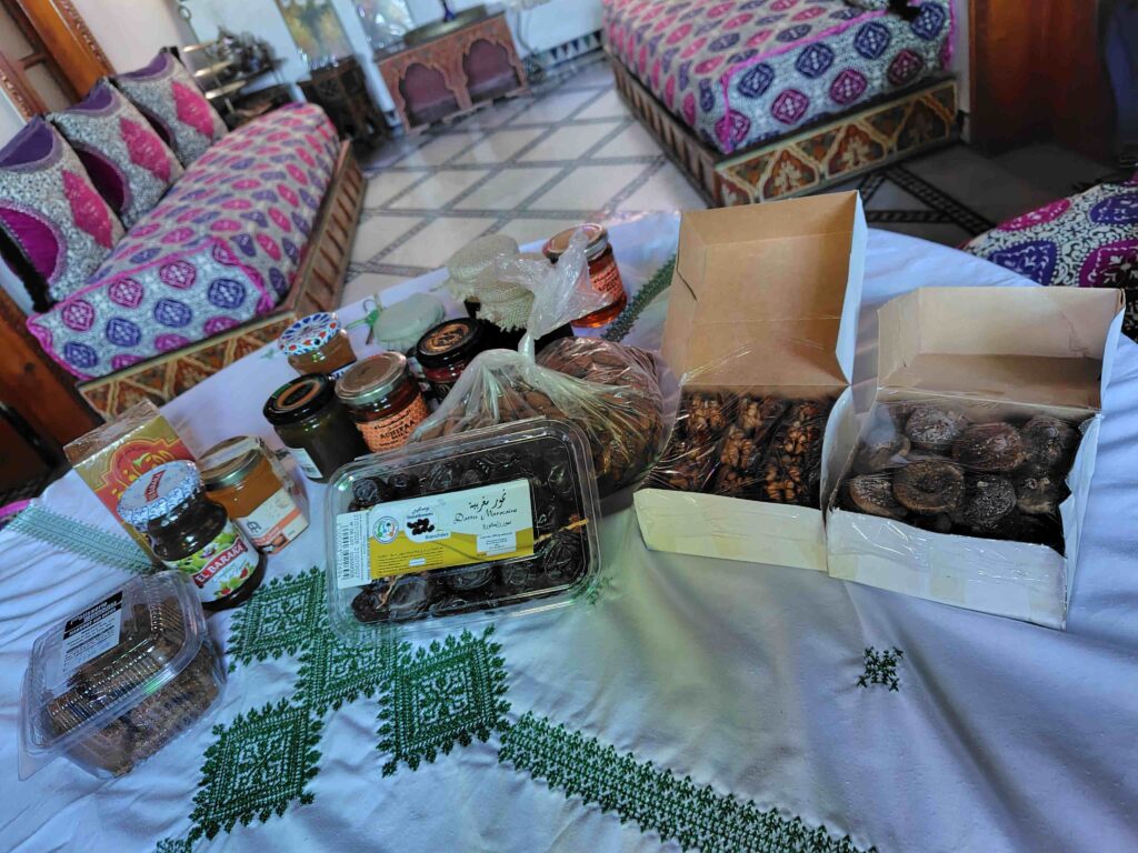 どちらも、飛行機で持って帰りやすい品々がたくさんあったので、いろいろ買ってみました。主に瓶に入ったジャム、はちみつや、オリーブオイルや、Amlouというアルガンとアーモンドのペーストをはちみつと混ぜたもの等です。はちみつはオレンジの花のものがおいしかったので(リヤドで味見)、それを買ってきました。くせのないすっきりした味わいで、ほんのり良い香りがします。乾燥したデーツやいちじくなども買いました。