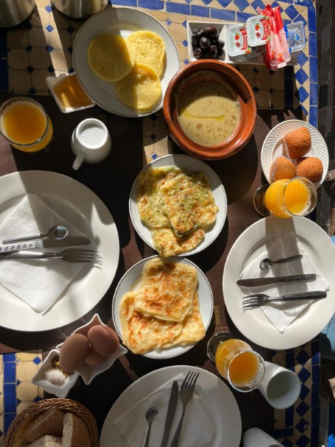 朝食はリヤドの屋上で。毎日少しずつ違うパンや、卵料理を青空の下でのんびりといただきました。鳥の鳴き声や、おんどりのコケコッコーが聞こえてくるので、何ともリラックスした気分になります。朝食は8時30分からで、ちょっと遅いかな、と思ったのですが、早くリヤドを出ても特にすることはないので、せっかくのお休みをのんびりと過ごすのに良かったです。
