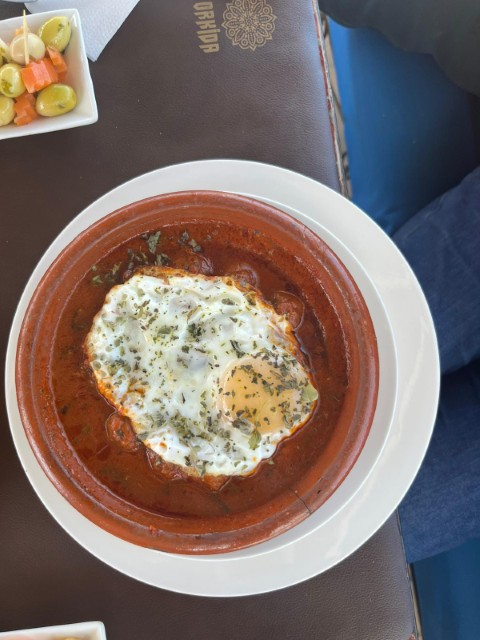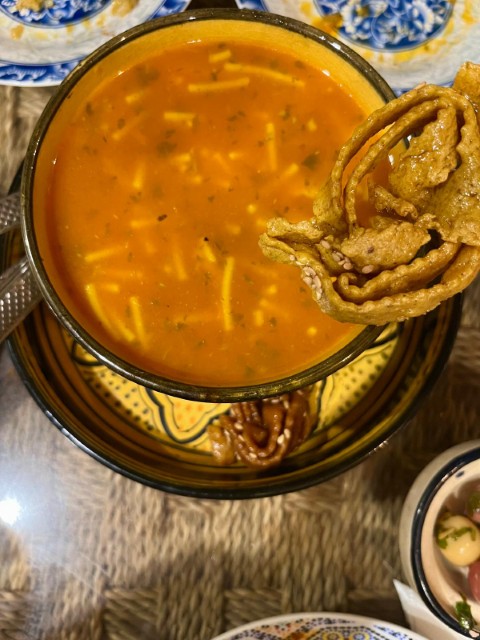 ハリラというスープはトマトベースの優しい味。ラマダン明けに食べるチェバキアという甘い揚げ物のお菓子と一緒に出てきて、このあまじょっぱい味を楽しむのだよと教えてもらいました。