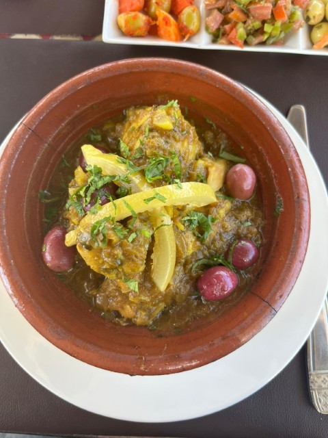 基本はタジンで、肉と野菜などをスパイスでマリネードして、タジンと呼ばれるとんがり帽子の蓋つきお鍋で料理したものをパンと一緒に食べます。大抵、頼まなくてもオリーブやサラダなどが待っている間に出てきたりするので、タジン一つ頼めば十分おなか一杯になります。