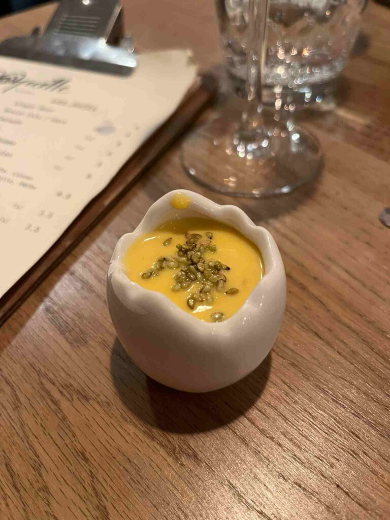 アミューズブッシュ(お口を楽しませるもの)と呼ばれる突き出しはかぼちゃのスープ。突き出し料はとられません。