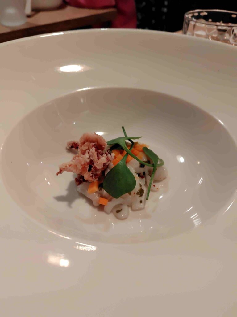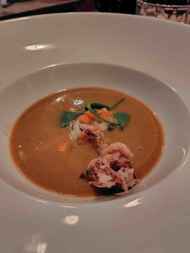 私のビスク(エビのオレンジなところとか、殻から抽出しただしのスープ)は、イカそうめんのようなお刺身と、イカの天ぷら(本当に天ぷらって言っていた)の上にかけられました。