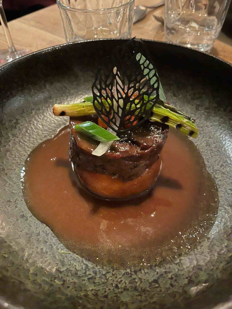 私のメインは牛のPaleron(肩ー腕のあたり)を煮込んだもので、サツマイモのピュレの上に乗っていました。見た目、味が濃そうですが、それほどでもなく、自分でちょっと塩をかけてしまいました。でも、そんな感じの方が、しょっぱすぎるよりは全然良いと思います。