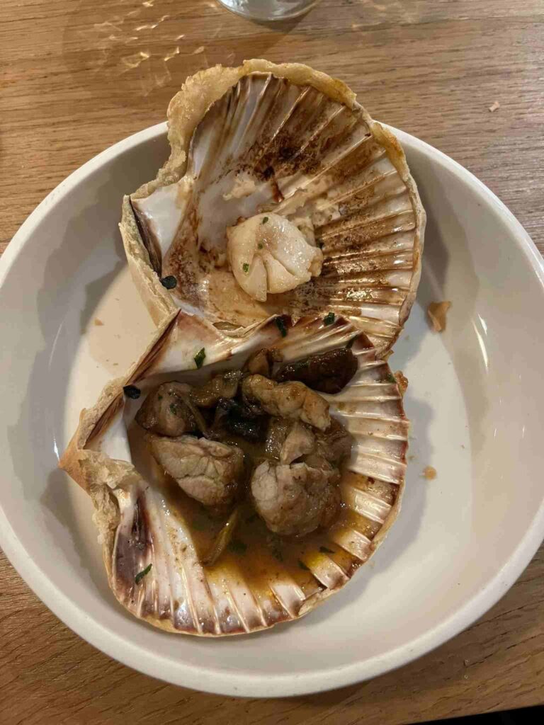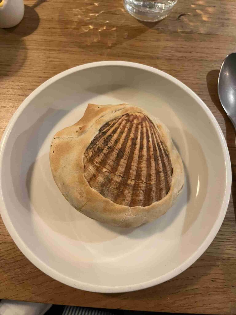 こちらは娘の前菜の帆立て貝。化石みたいな姿で現れましたが、開けると中からふわっと湯気が出て、リドヴォー(ris de veau 小牛の胸腺)と帆立の貝柱が現れました。とってもおいしかったそうです。