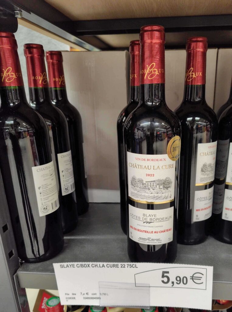 ボルドーのワインもスーパーではかなり安く売っているのですが(一部の超有名ワイナリーのものを除く)、こちらもお安く、6ユーロ以下でした(1000円くらい)。というわけで、毎日気軽に飲めるワインです。